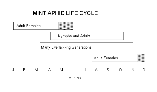soft-bodied aphids range in size from 1.5 to 2 mm long and occur in colonies on mint